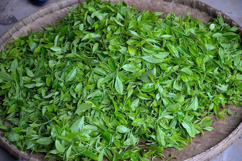 Fresh leaves are spread thinly and allowed to wither slightly, reducing moisture content and making them pliable for the next steps.